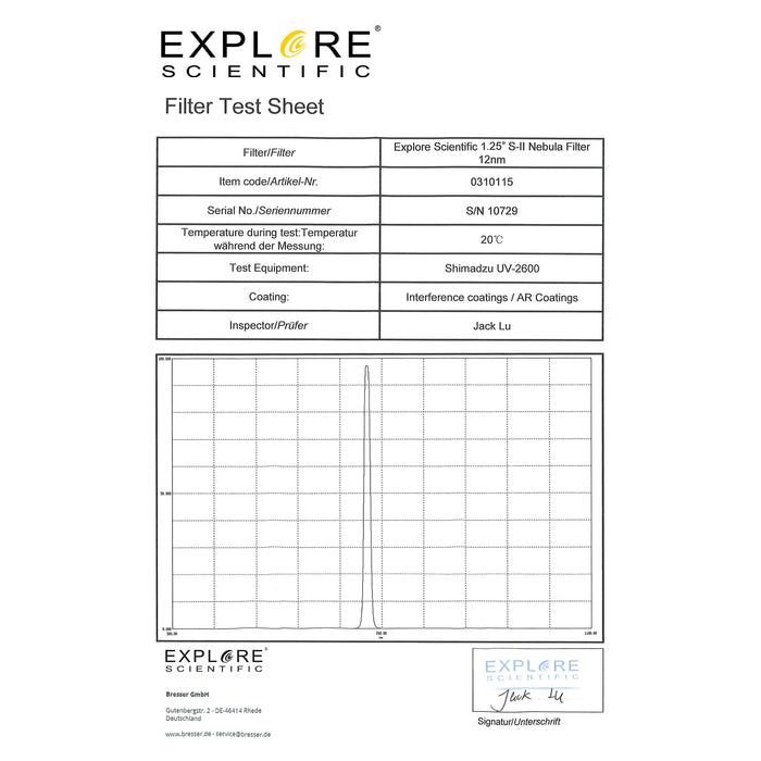 Die Explore Scientific Nebelfilter werden mit einem einzelnen Testbericht geliefert. Sie können also sicher sein, dass Sie hochwertige Filter erhalten.