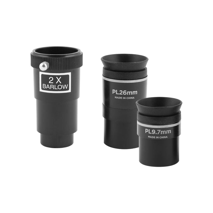 Comes with two Plössl eyepieces and a 2x Barlow lens for magnifications ranging from 26.9x to 144x.