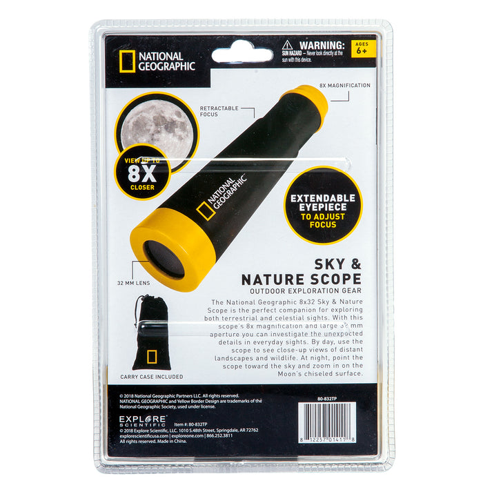 La portée du National Geographic 8x32 Sky & Nature est le compagnon idéal pour explorer les sites terrestres et célestes. Avec le grossissement 8X de cette portée et la grande ouverture de 32 mm, vous pouvez étudier les détails inattendus dans les sites quotidiennes. Le jour, utilisez la portée pour voir des vues rapprochées de paysages éloignés et de faune. La nuit, pointez la portée vers le ciel et zoomez sur la surface ciselée de la Lune.