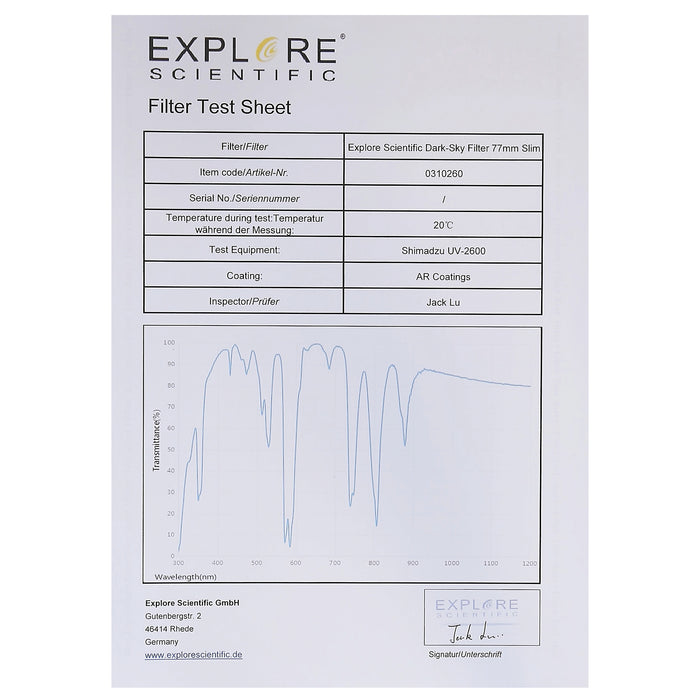Le lunghezze d'onda di 550 nm (verde) e 630nm (rosso), che sono particolarmente rilevanti per la fotografia di Aurora, vengono trasmesse a oltre il 90%. Una caratteristica speciale di altri cosiddetti filtri CLS è che solo la luce gialla della linea di sodio viene effettivamente bloccata a 590NMWILL. Ciò sopprime efficacemente le lampade di vapore di sodio dall'illuminazione stradale e dalle serre (luce di assimilazione). Questo è un chiaro vantaggio perché la luce gialla per la fotocamera digitale è sempre registrata come miscela di rosso e verde. Soprattutto con la fotografia di Aurora o le registrazioni delle nebulose di emissione, la successiva rimozione dell'inquinamento luminoso post-elaborazione delle foto sarebbe praticamente impossibile.