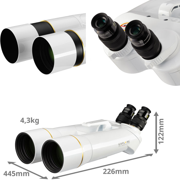 Take your astronomy and terrestrial observation to the next level with the Explore Scientific BT-82 82mm giant binoculars. Designed for both night sky enthusiasts and nature observers, these binoculars feature 82mm objective lenses and a 480mm focal length, producing bright, high-contrast images of celestial objects, distant landscapes, and terrestrial targets. Each eye benefits from its own complete optical system, creating a comfortable and immersive viewing experience with minimal eye fatigue. The BT-82 comes with two premium 62° 20mm LER eyepieces, producing 24x magnification and a 2.6° field of view. Interchangeable 1.25" eyepieces allow further customization, including filters for enhanced contrast and detail. Built for rugged outdoor use, the magnesium housing is IPX6 waterproof and nitrogen-purged to prevent internal fogging. Features like the 45° viewing angle, extendable dew caps, and fine helical focus ensure relaxed, precise observation. The integrated carrying handle facilitates transport and secure tripod assembly.